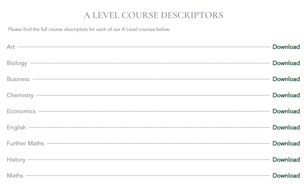 Please find the full course descriptors for each of our A Level courses in our Student Hub. They entail: